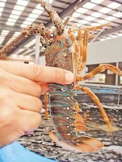 宜蘭縣金車養殖研發中心引進波紋龍蝦,讓遊客選購與嘗鮮。 (記者羅建旺/攝影) 金車生技水產養殖研發中心免費開放觀光,引進東台灣的波紋龍蝦,提供現蒸、現嘗服務,家住台北市的消費者還可宅配到家,把活跳跳的龍蝦送到家料理。 養殖中心設在宜蘭縣礁溪鄉淇武蘭路162之13號,有專人導覽,養蝦過程全都看得到,除300坪大的門市購物區與吧台區外,昨天新開放圓桶養殖池區,共有15桶,每桶可養殖1千公斤的白蝦。